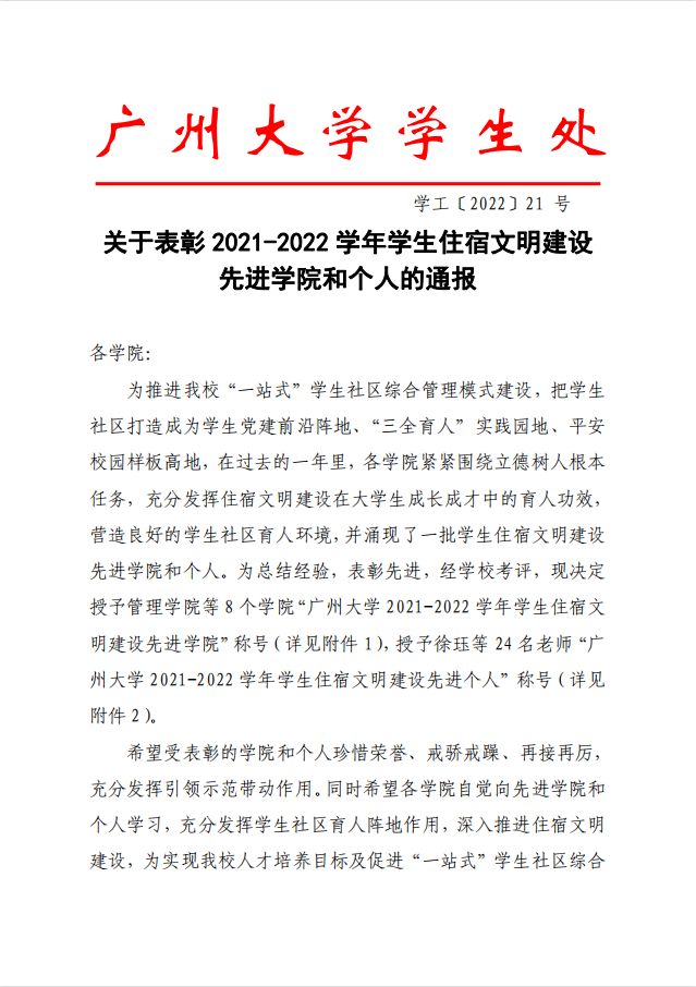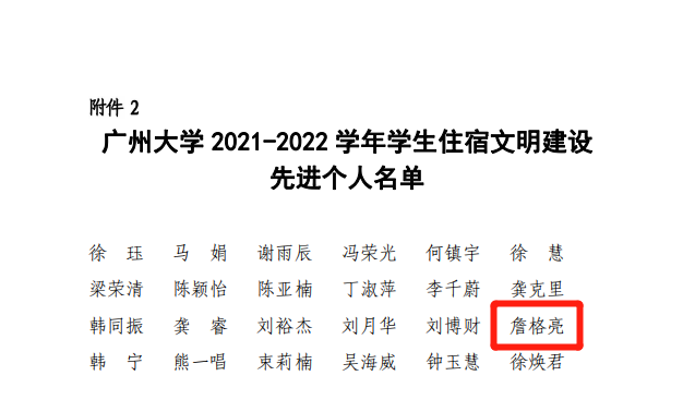 其中,我院荣获2021-2022学年学生住宿文明建设先进学院,詹格亮老师被评为2021-2022学年学生住宿文明建设先进个人。