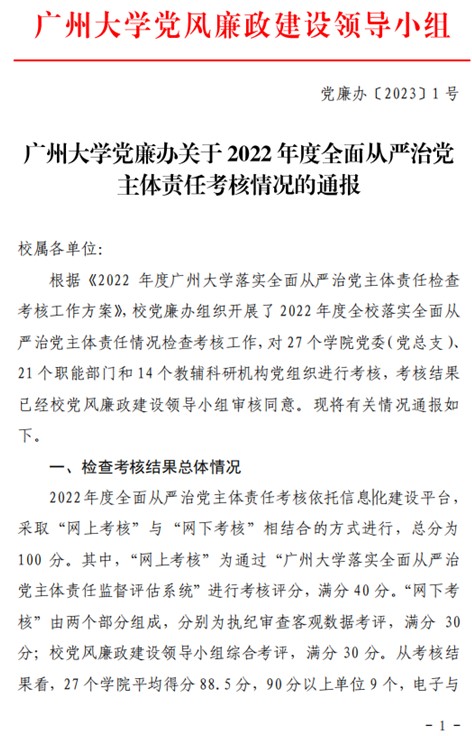 根据《sm调教 党廉办关于 2022 年度全面从严治党主体责任考核情况的通报》校党廉办组织开展了 2022 年度全校落实全面从严治党主体责任情况检查考核工作,对 27 个学院党委(党总支)、21 个职能部门和 14 个教辅科研机构党组织进行考核,考核结果已经校党风廉政建设领导小组审核同意。其中,27 个学院平均得分 88.5 分,90 分以上单位 9 个,sm调教 得分最高