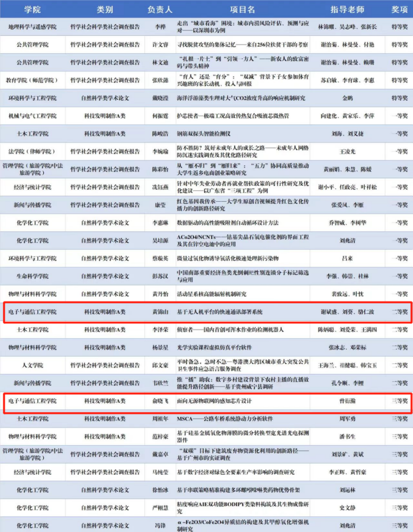5月27至28日,第十七届“挑战杯”广东大学生课外学术科技作品竞赛终审决赛在中山大学南校区隆重举行,我院师生斩获一个省二等奖和一个省三等奖的佳绩。其中由谢斌盛、刘葵、骆仁波老师指导,以黄锦山同学为负责人的项目“基于无人机平台的快速通讯部署系统”获得省二等奖;由曾衍瀚老师指导,俞晓飞同学负责的项目“面向无源物联网的感知芯片设计”获得省三等奖。
