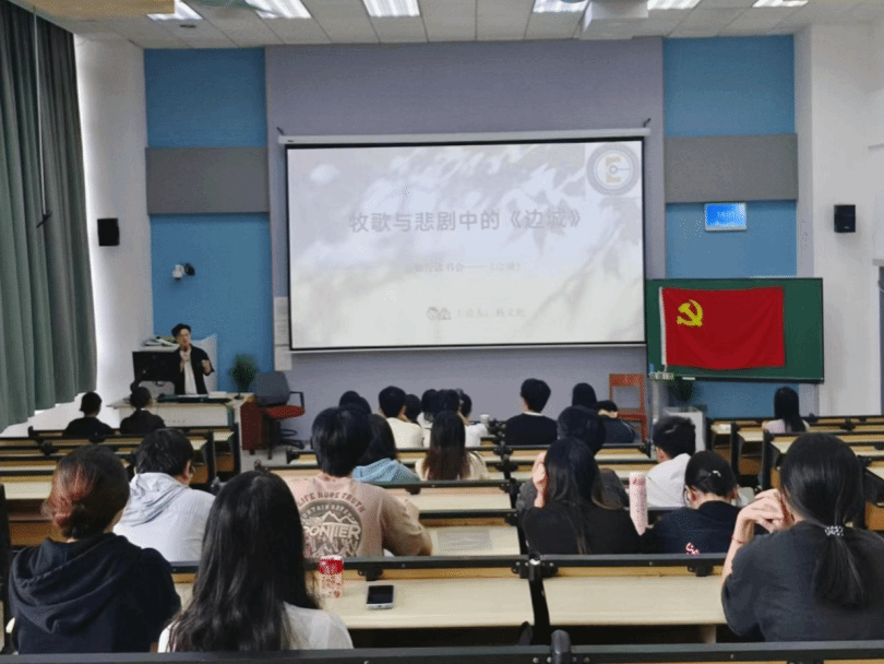 嘉宾导读结束后,学生第一党支部党员陈紫媚同学带来读书分享。陈紫媚同学剖析《边城》的创作背景,1934年的中国,正处于内忧外患的动荡转型期现代文明与传统农耕文明激烈碰撞。沈从文目睹都市文明中的虚伪与堕落,于是将目光投向故乡湘西,试图在文字中构筑一个未被现代“文明”玷污的纯净世界。茶峒镇的吊脚楼、龙舟赛,苗族与土家族的独特风情,不仅是故事的背景,更成为承载他理想人性的文化符号。