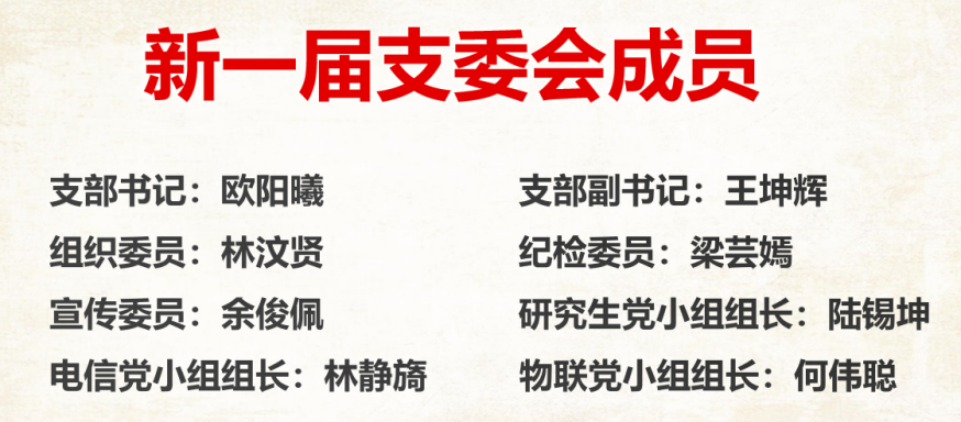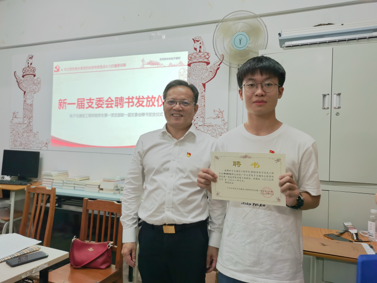 学生第一党支部换届的批复》后,为新一届支委欧阳曦、王坤辉、林汶贤、余俊佩、梁芸嫣、林静旖、陆锡坤、何伟聪颁发了聘书,并鼓励新一届的支委要在上一届支委工作的基础上,积极工作,努力打造支部工作的特色品牌。