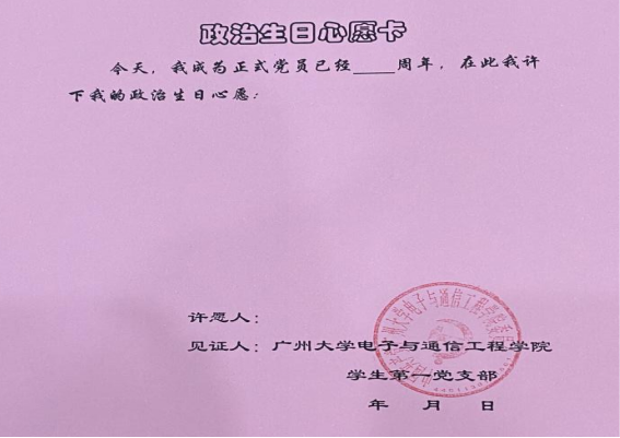2.赠送一张“政治生日”贺卡。支部书记将精心准备的生日贺卡和红色书籍赠送给9名学生党员,为他们送去“政治生日”的祝福,勉励学生党员时时提醒自己,不忘根本,在思想上打牢篱笆墙,不断以党员的标准,来清除思想和行动上的污浊,进行自我革命、自我更新。