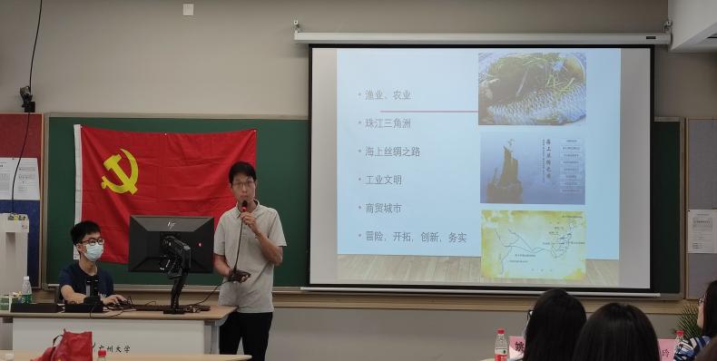 紧接着由导读嘉宾公共管理学院姚华松老师对这本书进行深层次解读。姚老师平时主要从事社会与文化地理、城乡发展、社会政策等方面的教学与研究。通过几组关键词对广州进行详细介绍,广州作为中国近现代革命的策源地,因其举足轻重的历史地位而在中国共产党的历史上熠熠生辉。从1922年“中共广东区委”成立,到中国共产党第三次全国代表大会在广州召开,再到1949年“广州全境解放”,从“广州农民运动讲习所”开办,到“广州起义创建苏维埃政府”,从通往世界“南大门”,到改革开放的试验田,广州既是百年党史的一段历史见证,又是一种精神的标签,在党的领导下,不畏艰险、勇于担当、甘于奉献,以实际行动表达坚定信念,不断激发斗争精神、增强斗争本领,推动各项事业“出新出彩”。
