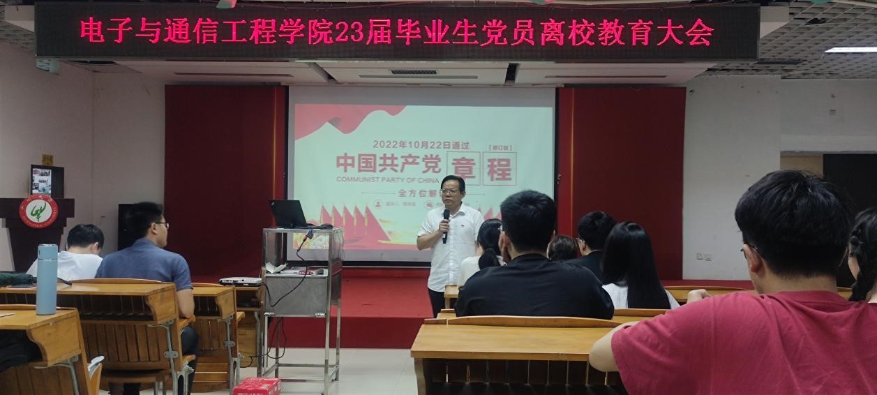 为了帮助同志们更好地开展学习贯彻习近平新时代中国特色社会主义思想主题教育的理论学习,党委书记陈泽龙以《中国共产党章程全方位解读》为题,为毕业生党员开展本科学习中最后一次专题党课。中国共产党是什么样的政党?为什么要入党?党徽党旗的正确使用?怎样发挥先锋模范作用?陈泽龙书记以一系列疑问开始本次党课,要求全体党员同志在本次主题教育期间,学好《习近平新时代中国特色社会主义思想专题摘编》、《习近平总书记广东考察重要讲话》、《论党的自我革命》等学习材料,特别是《中国共产党章程》。陈书记向与会同志讲解二十大对党章做的重要修改,而后对党章的基本架构进行解析,希望全体党员同志通过学习党章,进一步树立共产主义理想,坚定走中国特色社会主义道路的信念,提高坚持党的基本理论、基路线和基本纲领的自觉性,始终与党中央保持高度一致,并要求同志们在离校前的这段时间以习近平新时代中国特色社会主义思想的世界观和方法论为指导,学思想、强党性,感恩奋进做表率。
