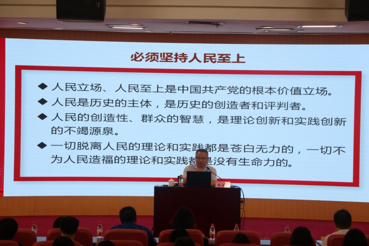 周建伟教授以“习近平新时代中国特色社会主义思想的世界观和方法论”为主题作辅导报告。报告结合党的二十大精神,深入解读了“六个必须坚持”的内涵、“六个必须坚持”在习近平新时代中国特色社会主义思想中的地位和意义,并从理论思想和生动实践的角度深入分析了“六个必须坚持”与“中国式现代化”的逻辑关系与实践探索。周教授讲到,科学的世界观和方法论是我们认识世界、改造世界的锐利思想武器,“六个必须坚持”系统概括了习近平新时代中国特色社会主义思想的根本立场、观点和方法,具有“表达简洁通俗、理论高屋建瓴、内容意涵深刻、问题指向明确、指导意义鲜明”的突出特点,彰显了习近平新时代中国特色社会主义思想的价值立场、理论品格和视野情怀,深刻揭示了我们党长盛不衰、风华正茂的奥秘所在,具有重大理论引领意义和实践指导意义。紧紧围绕党的二十大报告中关于中国式现代化的系统论述,聚焦中国式现代化的内涵、特色及本质要求,周教授进一步阐释了中国式现代化与六个必须坚持的内在联系。周教授指出,中国式现代化是中国共产党领导的社会主义现代化,是马克思主义中国化时代化的理论成果,推动中国式现代化取得新进展新突破,必须学深悟透习近平新时代中国特色社会主义思想,必须准确理解和把握“六个必须坚持”。