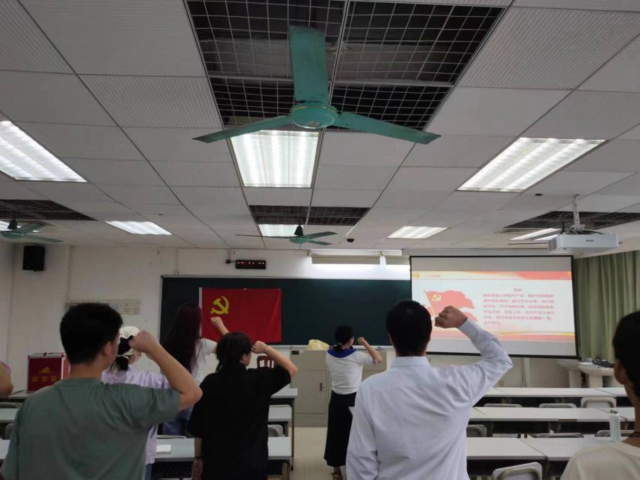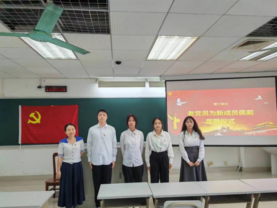 宣誓仪式上,新党员们着装整齐,在欧阳曦老师的带领下,面向党旗,许下铮铮誓言,严格要求自己,用中国共产党的思想理论武装头脑,发挥党员先锋模范带头作用。