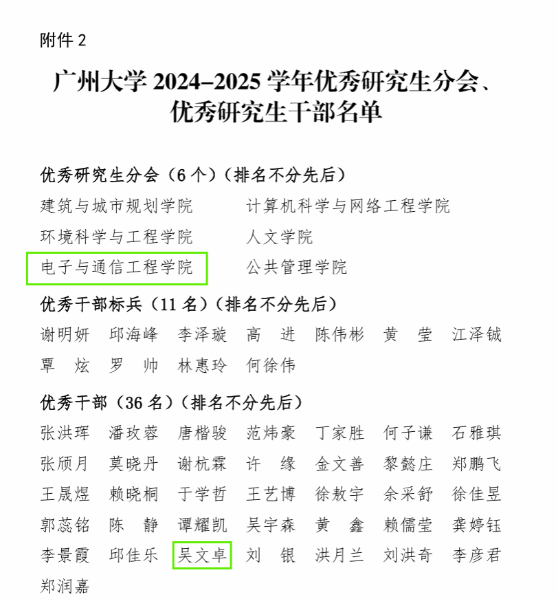 为鼓励我校研究生刻苦向学、精研求进、全面发展,根据学校相关文件要求,学校组织开展了 2025届优秀毕业研究生以及2024-2025 学年优秀研究生分会、优秀研究生干部等评选工作。经学院推荐、研究生院审核、校内公示等,我院研究生分会被授予2024-2025学年"优秀研究生分会"称号,23级研究生吴文卓同学获评2024-2025学年优秀研究生分会优秀研究生干部,罗敏等9名同学获评2025 届优秀毕业研究生。