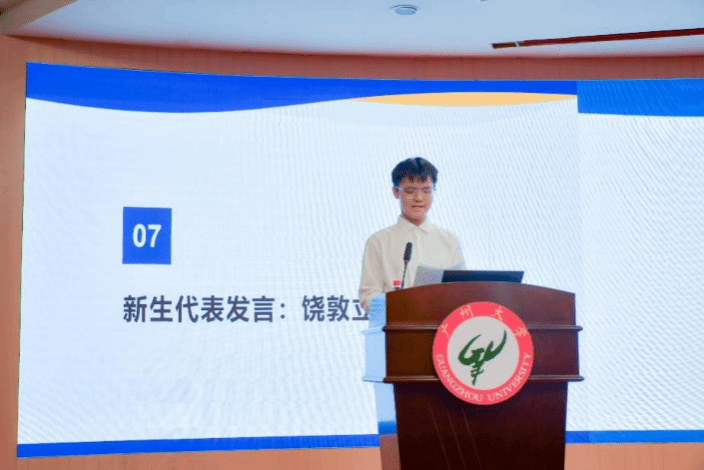 接着,电信252班饶敦立作为新生代表发言。他以“启航‘电’亮未来,同行‘智’写新篇”为题,表达了初入大学的激动与期待。他提出新生应积极投入专业学习,善用学校资源,参与科创竞赛与社团活动,全面提升能力。同时,他也强调大学生活的多样性,鼓励同学们在学习之余丰富生活体验,培养综合素质,努力成长为适应时代发展的新时代青年。