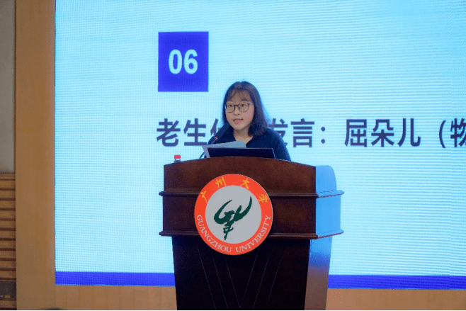 物联网工程223班屈朵儿作为老生代表发言。她以“乘秋风之势,启梦想之航”为题,从三方面分享大学成长经验:一是注重身心健康与实践探索,强调通过参与活动和竞赛明确方向;二是倡导探索式学习,鼓励新生主动构建知识体系,勇于创新;三是呼吁保持沉稳心态,脚踏实地积累实力,成为“长期主义者”。