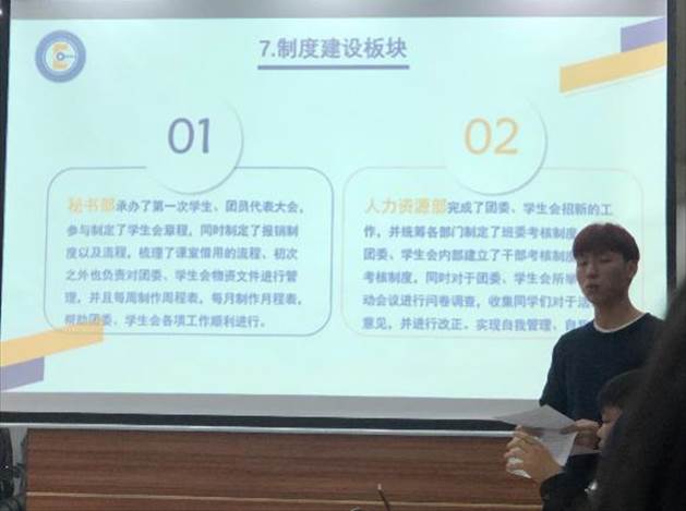 院学生会执行主席张扬,学一党支部副书记张芸洁,学二党支部副书记肖波,党建理事会副会长翁璇华以及舍区办主任胡琳淳依次汇报工作,大家回顾这一学期主要开展的活动内容,汇报自己所在部门一学期所完成的主要工作,总结自己的优势,并反思自己的不足,汇报总结精准概括,反思深刻到位,能体现出各学生干部在其位,谋其政,对待工作认真负责,设身处地为同学们着想,希望尽自己的能力将学生工作圆满完成,并将同学的体验感作为自己开展工作的一个必不可少的考量标准。