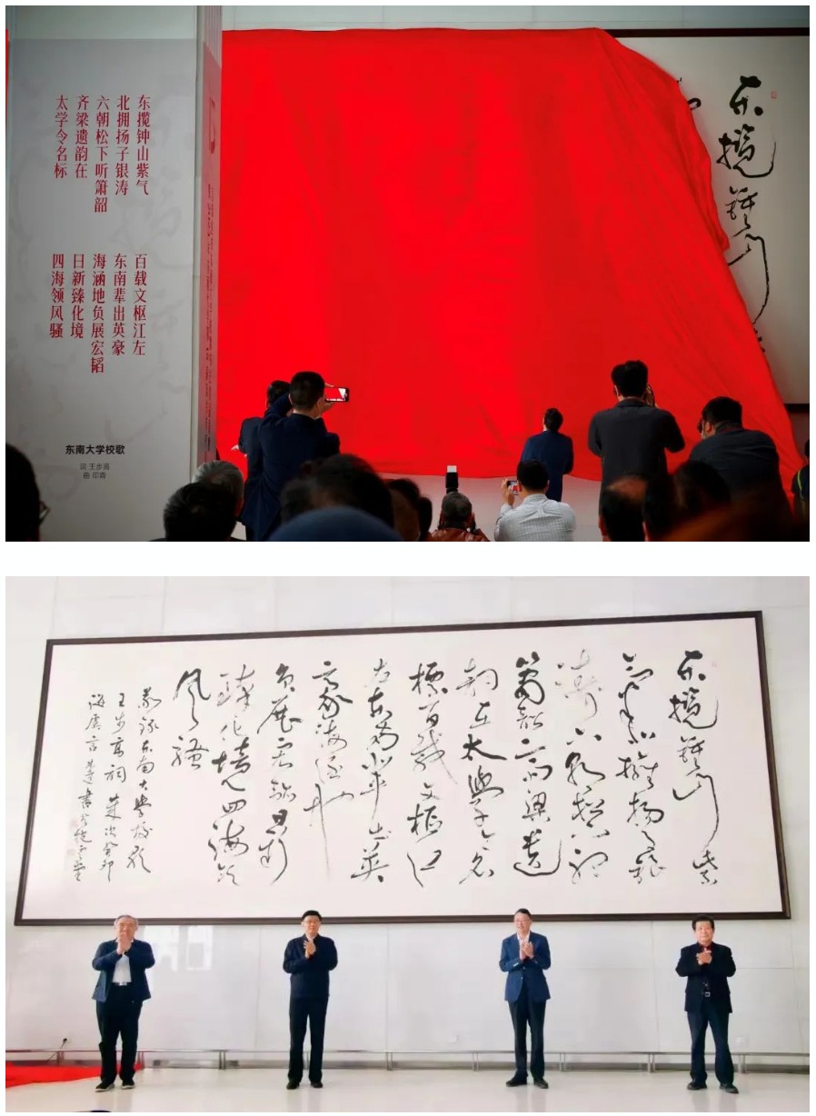 “东揽钟山紫气,北拥扬子银涛”今日的书法作品捐赠暨读书节开幕仪式以东南大学的校歌为开场。言恭达教授以其卓越的书法才华,为东南大学题写校歌书法,其作品之精美,无疑是校园文化的又一瑰宝。其所用书法,将大草书体之精髓展现的淋漓尽致,结构宽广而连贯,气势恢宏,字形凝重而古朴。同时,大草字体的渐变线条和丰富的变化形态,也让这幅作品刚柔相济,字迹更为苍劲有力,彰显出东南大学雄伟壮丽的校园氛围。言恭达教授的书法,为校园文化注入了强烈的时代气息。在揭幕仪式上,言教授还对我们青年学子进行了勉励,表示学生们应当牢记自身文化使命,守护住自己的精神与思想,走好自己的路,在这个文化围城的时代下守护住中华宝贵的文化瑰宝。我想作为新一代青年之一的我,也应当和东南大学校歌中的“四海领风骚”一般保持大的格局,站在整个中华民族的高度上看待传统文化与文化精神,为中华传统文化的传承也尽一份自己的绵薄之力。
