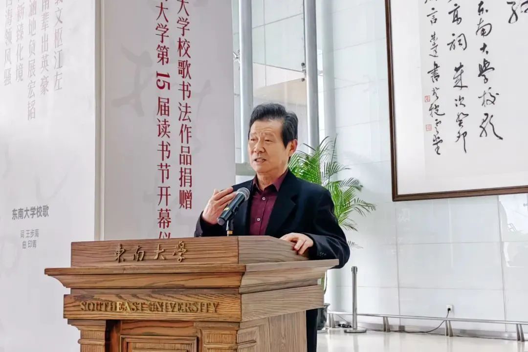东南大学校歌书法作品捐赠暨2023年东南大学第15届读书节开幕仪式上,馆长李爱国介绍到场嘉宾并对各位的到场表示感谢与欢迎。