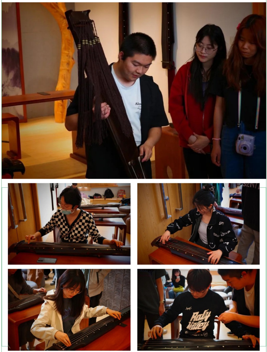 下午参观东南大学的中华优秀传统文化传承基地,期间来自东南大学的演奏者从古琴的形制、材料、琴弦与音色等方面向大家一一展开了描述。古琴的外形修长,由复瓦型的面板和平直的底合成一扁箱式整体,上边分布着七根琴弦,划分为 13 徽位。紧接着演奏者向大家展示了古琴的基本指法--勾、挑,并跟大家讲述古琴演奏者往往就坐于4~5 徽位置处,左手负责音准,右手负责拨弦,拨弦手指要柔和,均匀发力。随后大家在东南大学梅庵琴社成员的指导下亲身体验了古琴的弹奏,深深的感受到古琴音律的优雅动听。