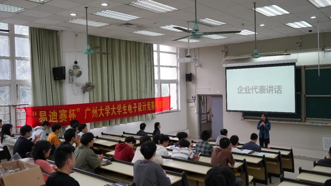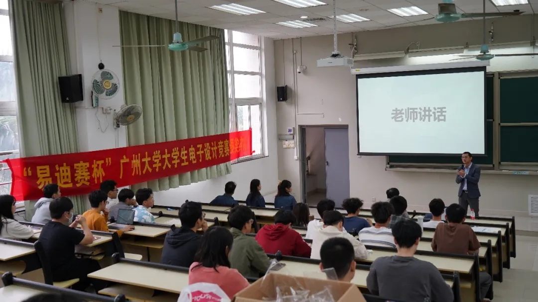 副院长曾衍瀚代表学院对获奖选手表示热烈祝贺,勉励同学们主动自愿参与学科竞赛活动,希望能够有更多的队伍来报名电子设计大赛。在活动中学习,在活动中思考,持之以恒,不懈努力,培养学科思维,提升学习能力,提升学习品质,为大学学习奠定坚实的基础。同时感谢赞助商“广州易迪赛智能科技有限公司”对比赛的大力支持,并表示希望双方能够在产学研、校企合作等方面开展深入的交流与合作。