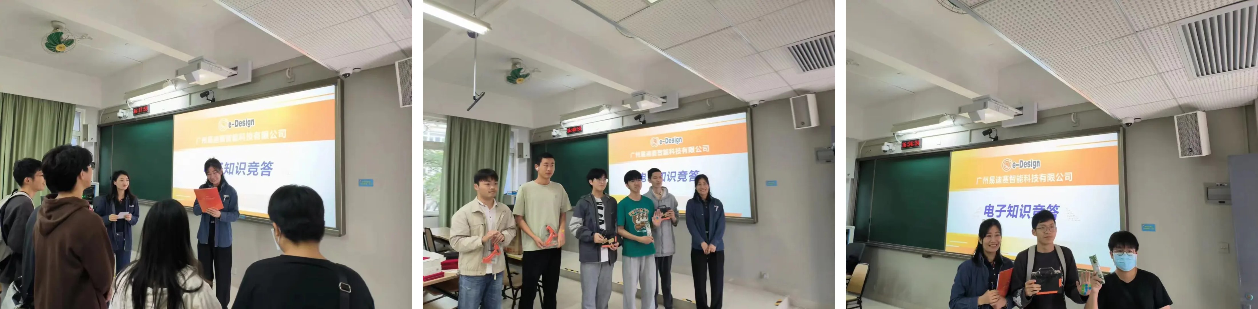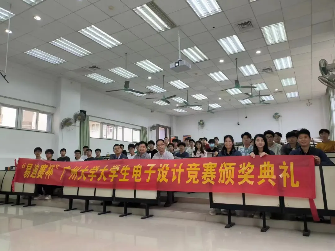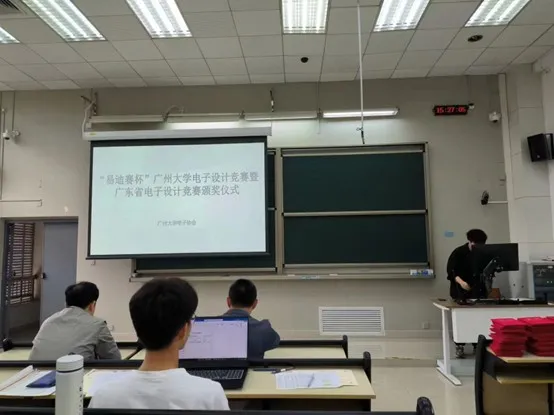 副院长曾衍瀚、冯锦澎老师以及赞助商“广州易迪赛智能科技有限公司”代表张丽慧女士和黄琴女士分别为“易迪赛杯”和广东省电子设计竞赛的一等奖、二等奖、三等奖进行颁奖。
