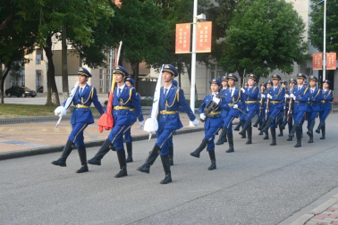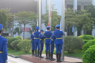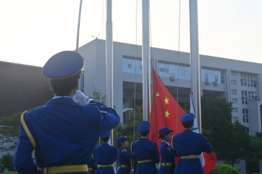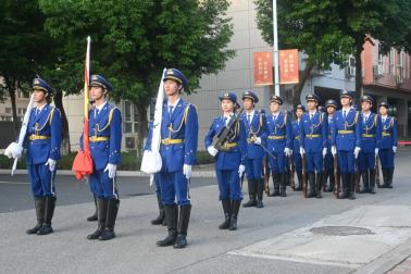 升旗仪式开始时,全体肃立。国旗护卫队迈着整齐有力的步伐完成出旗仪式,在国旗与校旗的飘扬下,全体师生奏唱国歌、校歌。