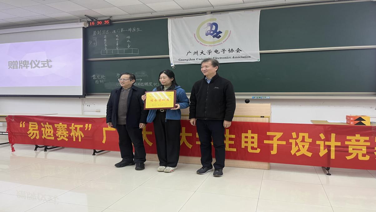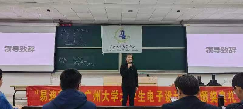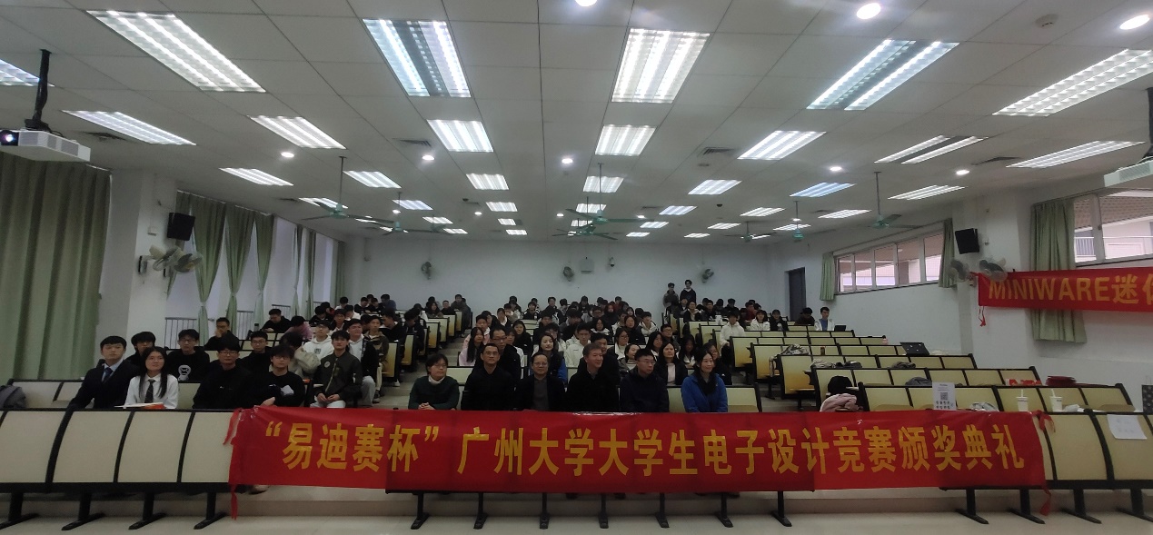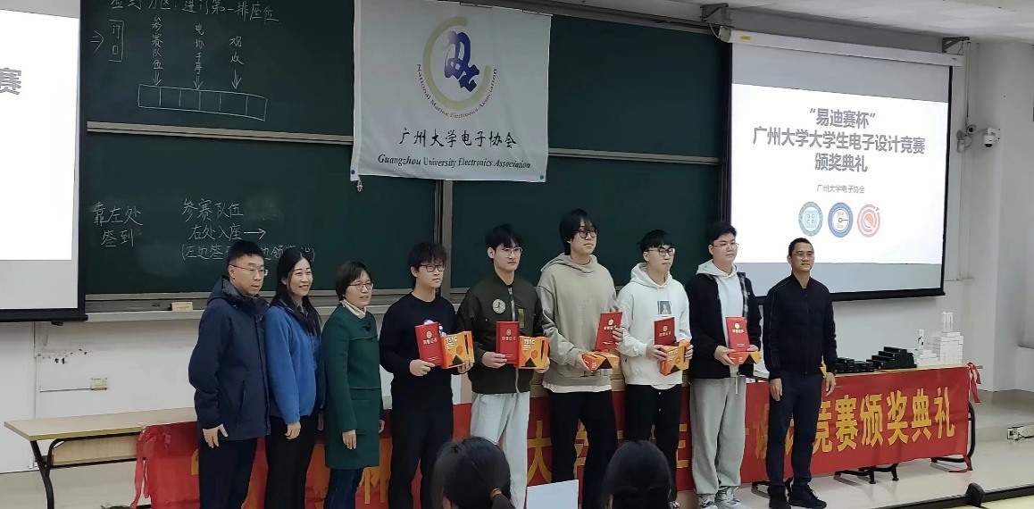 电子设计竞赛颁奖仪式隆重召开。学院党委书记陈泽龙、院长唐冬、副院长陈庆春、副院长曾衍瀚、党委副书记谢玲、辅导员王沁芳和欧阳曦、赛事负责人揭海和冯锦澎老师以及获奖学生出席,校电赛赞助单位广州易迪赛智能科技有限公司代表张丽慧女士、熊辉先生和黄琴女士亦到场,为获奖学生带来了丰富的奖品。