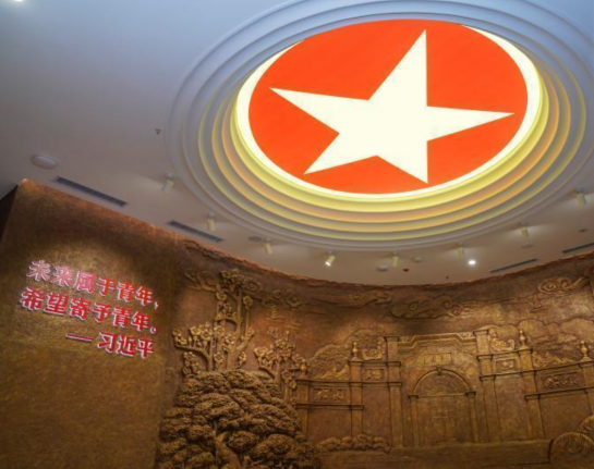在团一大广场上有一块极为醒目的红砂岩雕塑,雕塑由中间展开的中国共青团团旗与两侧的基座组成,基座上分别铭刻着的入团誓词与“团一大旧址”信息无声地告诉大家,100多年以前,来自全国各地社会主义青年团的25名正式代表在这里掀起了青运赤潮。在红砂岩雕塑的背后就是团一大纪念馆,馆内藏品丰富,记载着中国共青团百余年的历程。