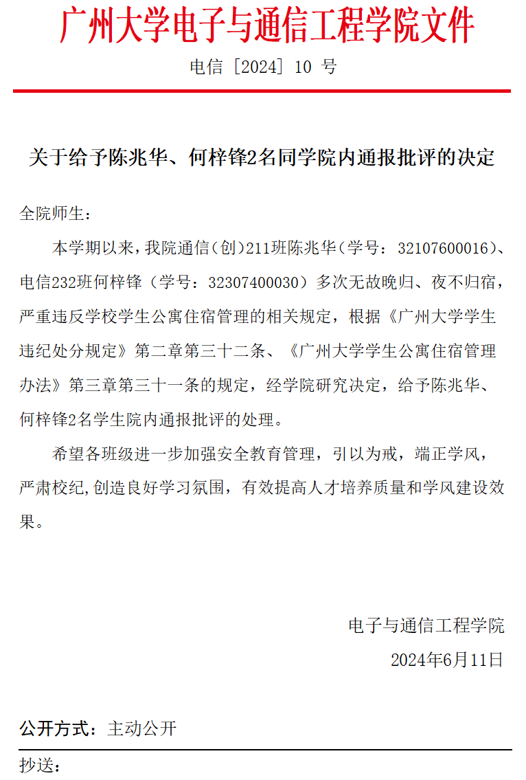 关于给予陈兆华、何梓锋2名同学院内通报批评的决定