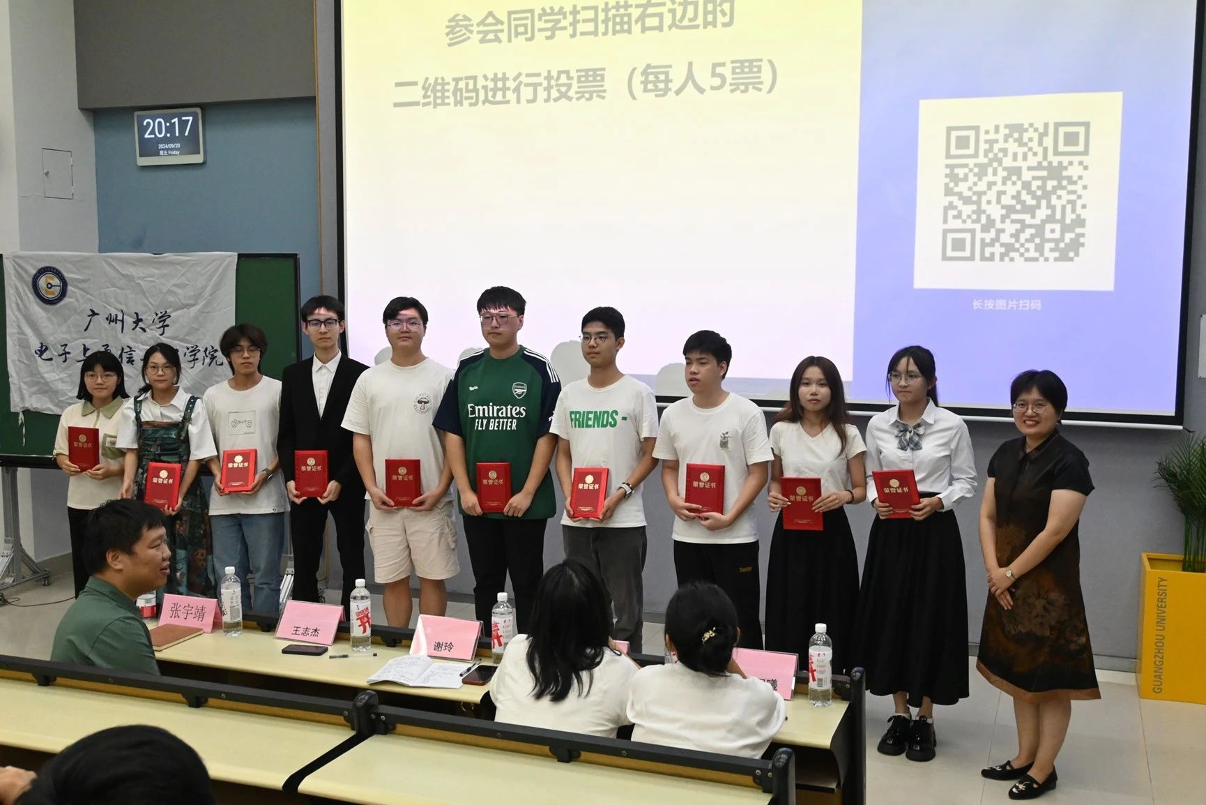 评委,同学评分:由评委老师对学生的综合表现进行打分,在场同学可通过扫描屏幕上的二维码参与投票,每人限投5票,共同选出心目中的“十佳学生”。