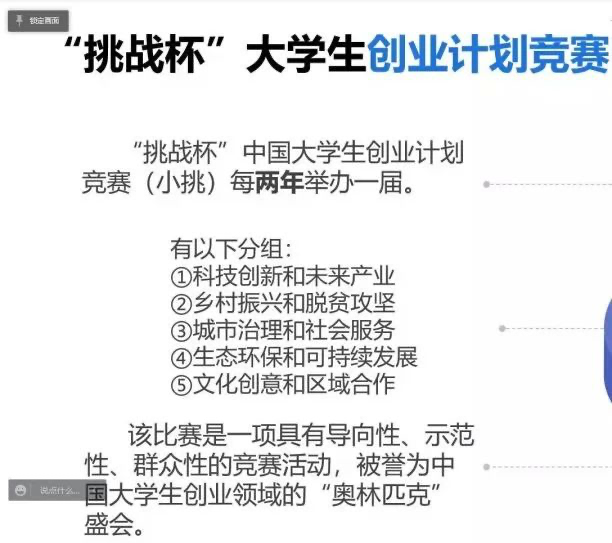 最后,来自校团委科学技术学术中心的徐心怡同学为大家介绍了如:挑战杯、创业大赛、攀登计划、各专项赛等比赛的相关情况。其中着重介绍了前面提及较少的“挑战杯”大学生创业计划竞赛,简称“小挑”。其分为科技创新和未来产业、乡村振兴和脱贫攻坚、城市治理和社会服务、生态环保和可持续发展、文化创意和区域合作这五个大类,该比赛是一项具有导向性、示范性、群众性的竞赛活动,被誉为中国大学生创业领域的“奥林匹克”盛会。最后还强调了一些参加比赛的注意事项。