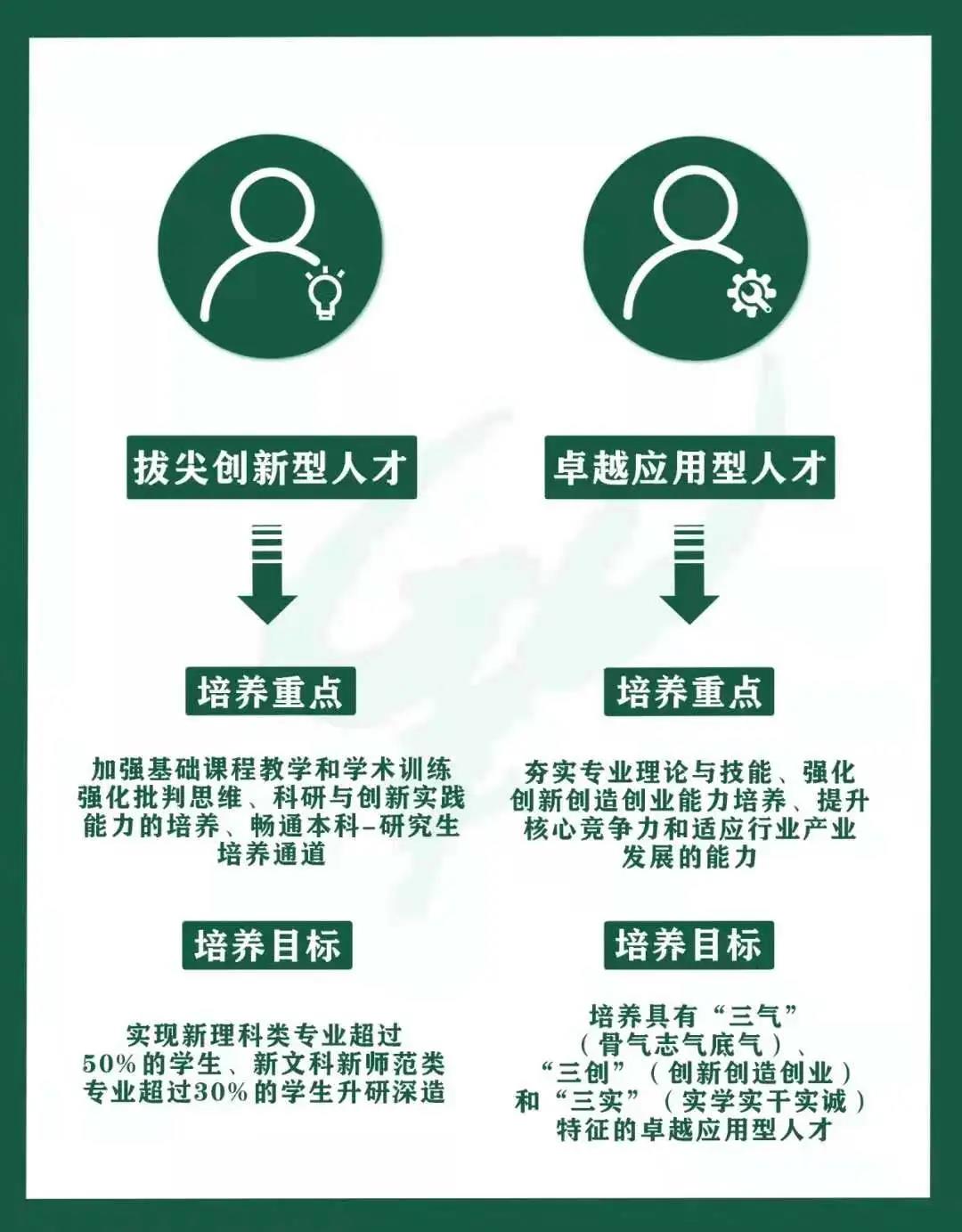 从2021级我校开始实施新版人才本科培养方案。该培养方案强调要对接国家和粤港澳大湾区发展战略、社会需求和学生成长需要,适应新科技与产业变革趋势,将在全部学院全专业全覆盖开通拔尖创新人才实验班和卓越应用班,从课程体系、教学模式、学习资源、优质师资等方面全面改革,设置拔尖创新型和卓越应用型两大类的人才培养体系,预计将有超过30%的学生通过选拔入读拔尖创新班,拔尖创新人才培养,重点是加强基础课程教学和学术训练,强化学生批判思维、科研与创新实践能力的培养,引导学习志趣,畅通本科-研究生培养通道,逐步实现部分理工科专业有超过50%学生、所有专业有超过25%学生继续深造学习的目标。