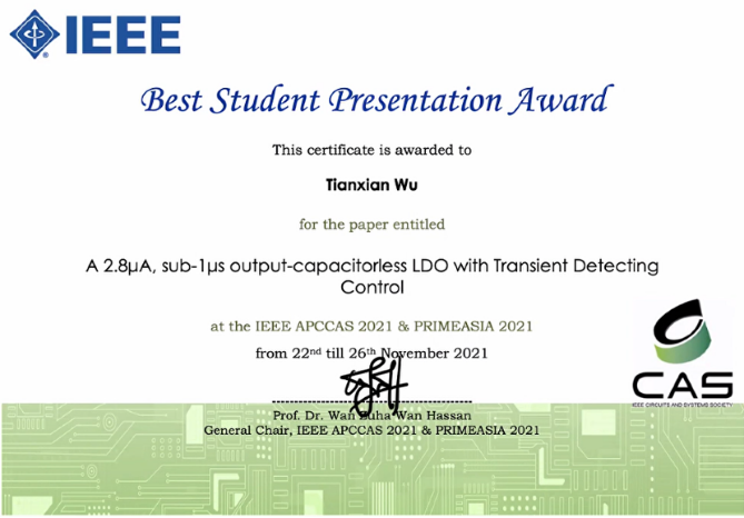 我院本科生在IEEE APCCAS会议上获得Best Presentation奖
