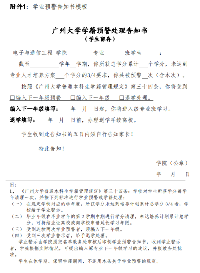 学籍预警处理告知书》(详见附件1)一式两份。并将“学生留存页”一份上交学工办,“学生留存页”一份及“学院留存页”两份分发给相关班级班主任。