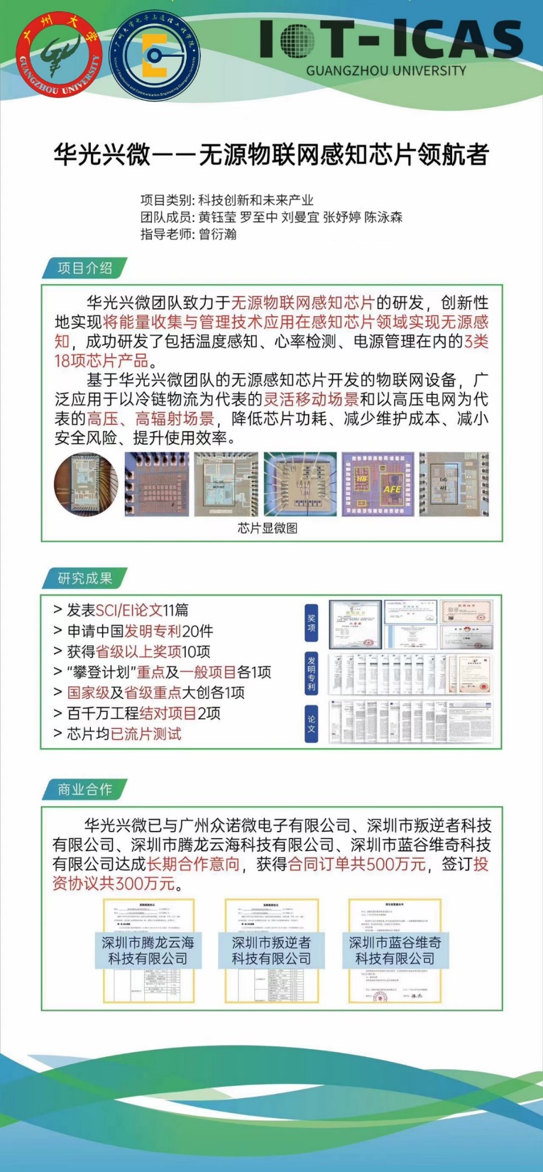 华光兴微团队致力于无源物联网感知芯片的研发,创新性地实现将能量收集与管理技术应用在感知芯片领域实现五元感知,成果研发了包括温度感知、心率检测、电源管理在内的3类18项芯片产品。