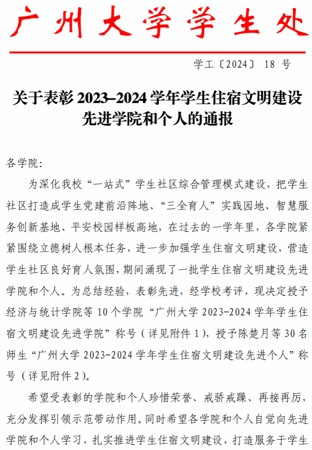 其中,我院荣获2023-2024学年学生住宿文明建设先进学院,张宇靖老师被评为2023-2024学年学生住宿文明建设先进个人。