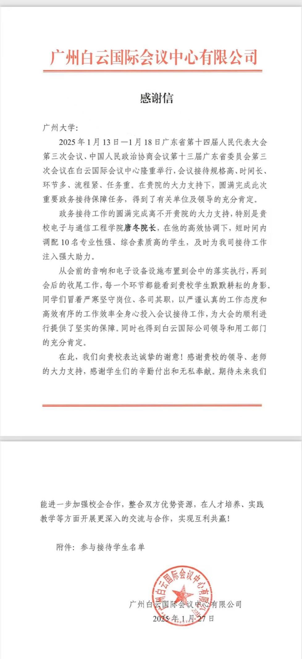 收到广州白云国际会议中心有限公司发来的感谢信,信中高度赞扬学院师生在2025年1月13日至18日广东省第十四届人民代表大会第三次会议、中国人民政治协商会议第十三届广东省委员会第三次会议中的卓越贡献。此次政务接待任务规格高、环节多、时间紧,学院师生以专业素养与敬业精神,为会议圆满举办提供了坚实保障,再次彰显了电信学子的责任担当与家国情怀。