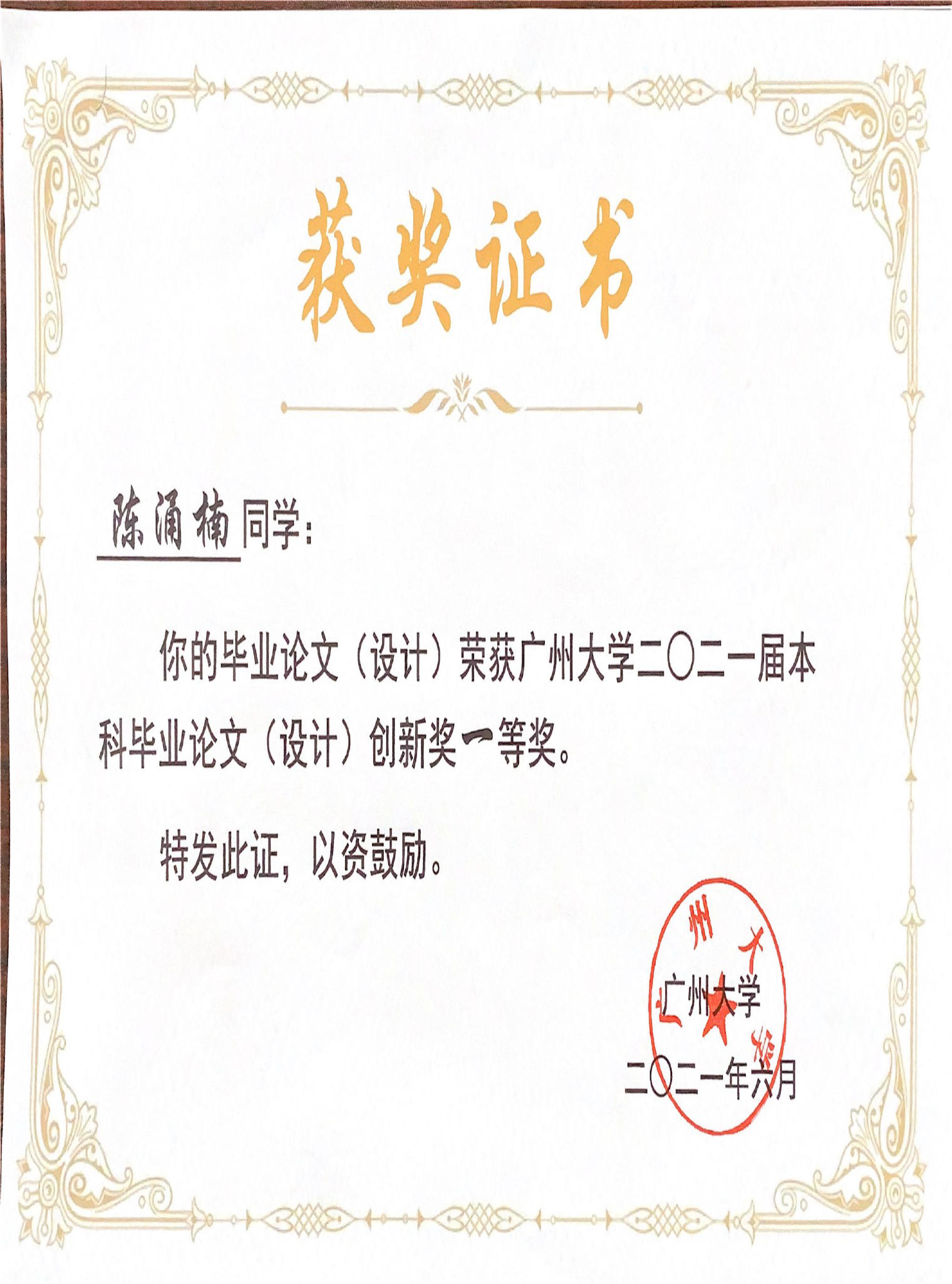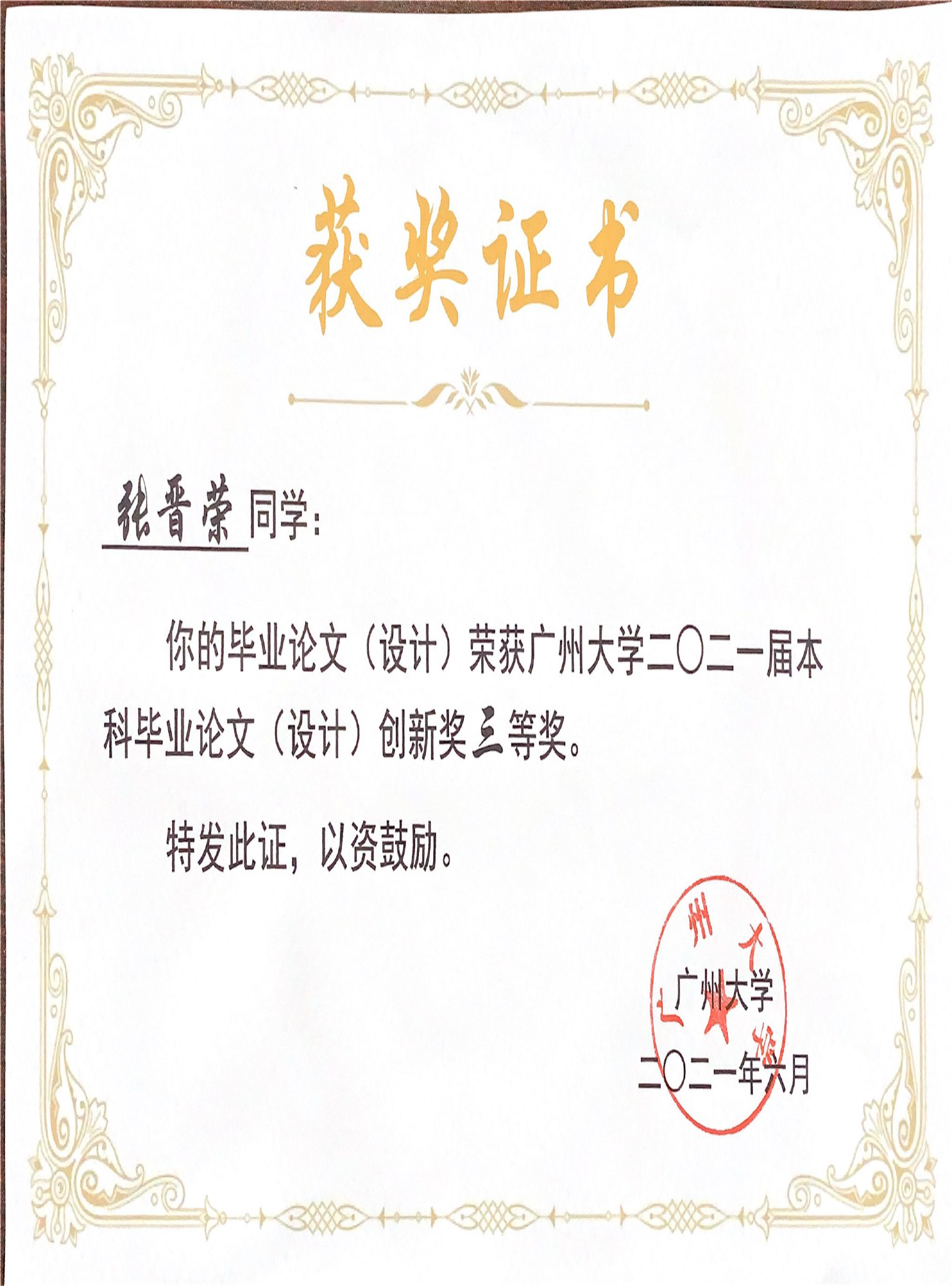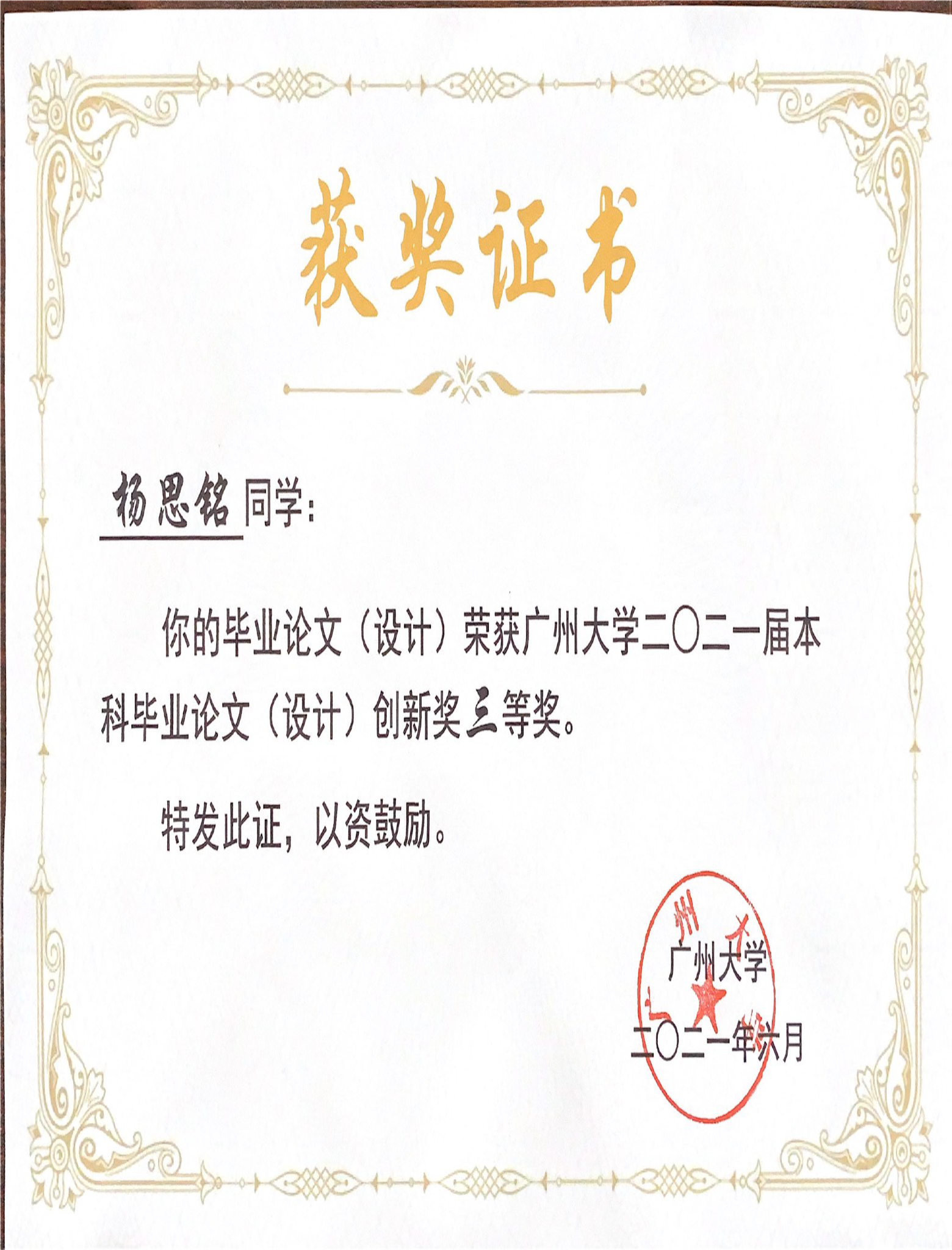 为了加强我校本科生毕业论文(设计)工作,培养学生综合素质、创新意识和创新能力,学校今年继续组织开展了毕业论文(设计)创新奖的评选。6月16日,经学生本人申请、指导教师推荐、学院审核、学校组织专家对 71 篇毕业论文(设计)进行网络评审及公开答辩、评审委员会审定一等奖8篇(项)、二等奖16篇(项)、三等奖26篇(项)。其中,我院2017级电子专业陈涌楠、2017级电信专业张晋荣和2017级物联网专业杨思铭3位同学获本科毕业论文(设计)创新奖,其中陈涌楠同学获得一等奖、张晋荣和杨思铭同学获得三等奖。(文案:廖婷 审稿:谢玲)