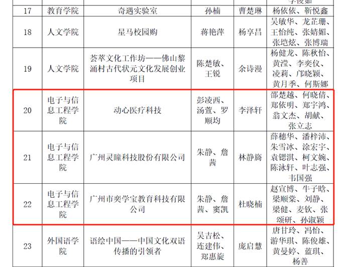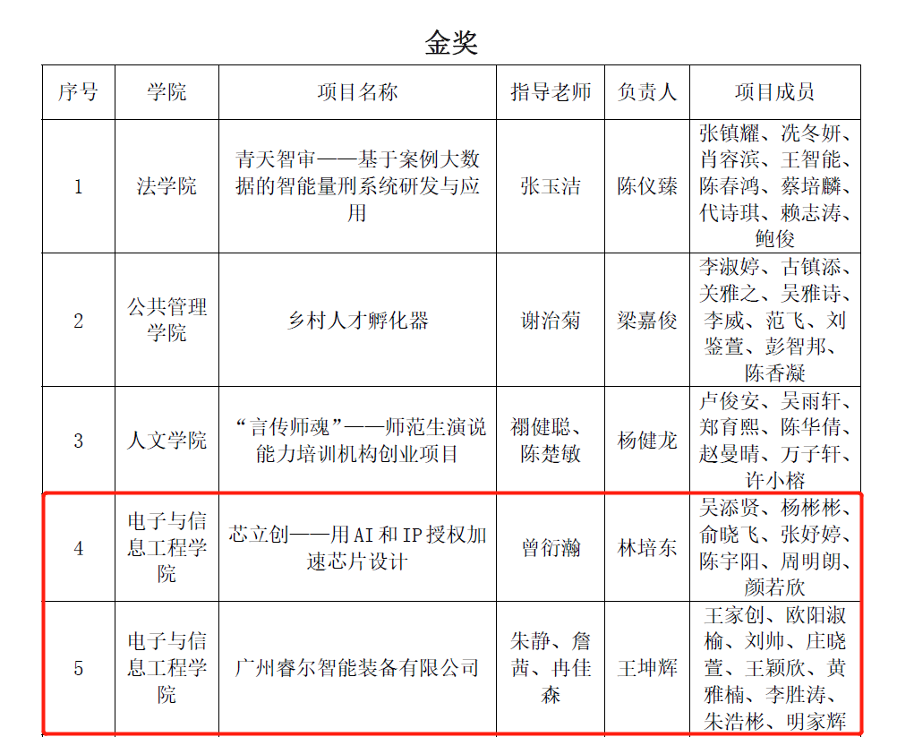 其中,我院《芯立创——用AI IP 授权加速芯片设计》、《广州睿尔智能装备有限公司》两件作品获得金奖;《动心医疗科技》、《广州灵瞳科技股份有限公司》、《广州市奕学宝教育科技有限公司》三件作品获得银奖。详见下图。