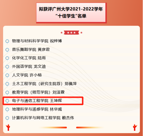 物联193班学生,曾担任学生第三党支部副书记、团委组织部负责人等职务。连续两年综合测评成绩专业第一。发表EI论文一篇、投递SCI论文一篇,申请发明专利6项。曾获得国家奖学金、中国科学院大学大学生奖学金、BEST PRESENTATION AWARD ON ICAIBD 2022(ICAIBD最佳报告奖)、广东省第十三届“挑战杯”大学生创业计划大赛银奖、中国高校计算机大赛-人工智能创意赛华南赛区二等奖、广东省第八届“互联网+”大赛铜奖、广州市优秀共青团员等荣誉奖项,现推免至中国科学院大学攻读硕士研究生学位,同时获得中国科学院大学大学生奖学金。