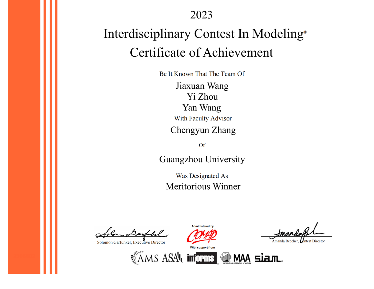在我院张承云老师的指导下,我院2020级电子信息工程本科生王嘉轩、周易和王岩组建的参赛队在跨学科数学建模竞赛(ICM)中荣获赛事的Meritorious Winner(国际一等奖)。