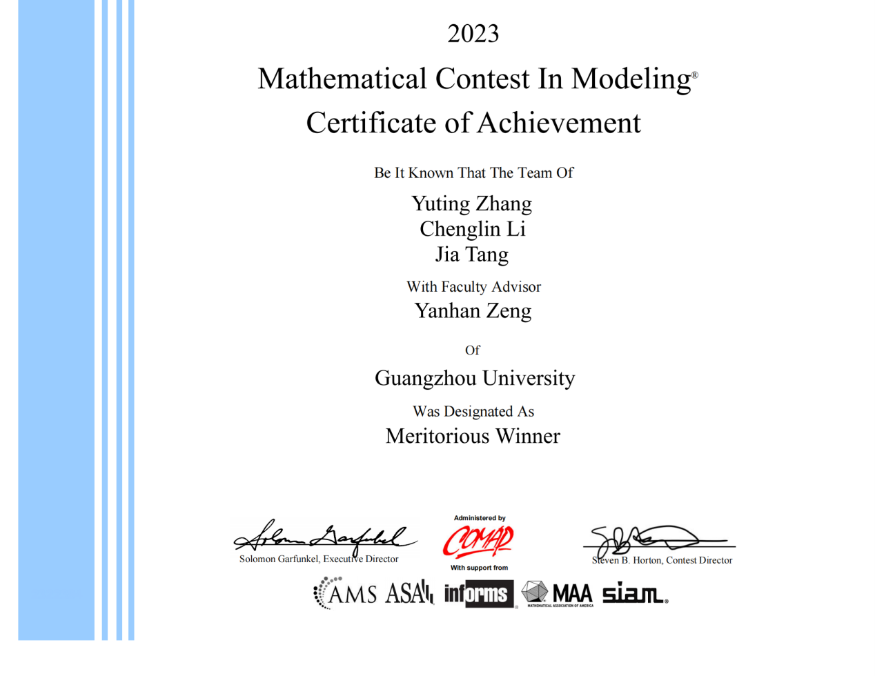 在我院曾衍瀚老师的指导下,我院2020级通信工程专业本科生张妤婷、2020级电子信息工程本科生李成霖组建的参赛队在数学建模竞赛(MCM)中荣获赛事的Meritorious Winner(国际一等奖)。