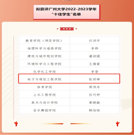 学生评奖评优评审小组综合评审,拟评定付洪宇等10名同学为我校2022-2023学年度“十佳学生”。其中我院通信201班张妤婷同学成功入选。成事自来输有志,不教勋业镜中看。“十佳大学生”评选作为学校品牌校园文化活动,旨在树立身边先进典型、发挥榜样引领作用,激发广大学生的进取精神,助力营造优良校风学风。