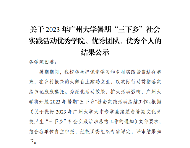 大中专学生志愿者暑期文化科技卫生“三下乡”社会实践活动总结工作的通知》文件要求,结合各单位自主申报,经学校团委组织专家评定,评选出9个优秀学院、23支优秀团队和105名优秀个人。其中,我院“大岭村农民工子弟学校支教服务队”荣获优秀团队、张虓和陈柏瀚优秀个人称号。