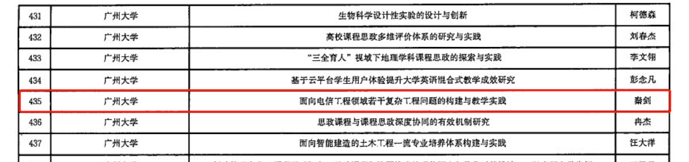 按照《广东省教育厅关于开展2021年度广东省本科高校教学质量与教学改革工程项目申报推荐工作的通知》等文件安排,经学校遴选、公示、推荐及省教育厅审核、评审、公示,确定立项建设省级实验教学示范中心37个、校企联合实验室20个、科产教融合实践教学基地65个、大学生社会实践教学基地49个、教师教学发展中心6个,课程教研室119个、现代产业学院26个、专项人才培养计划59个、高等教育教学改革项目762个(含委托类高等教育教学改革项目6个)。其中,我院秦剑老师在高等教育教学改革项目中成功立项。