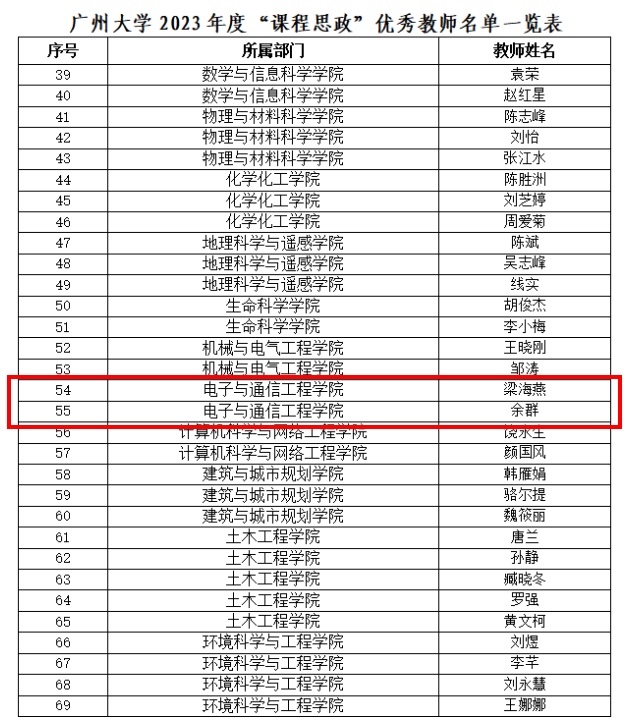 课程思政建设实施方案(试行)》(广大〔2020〕105号)精神,在学校党委的正确领导下,2023年度我校课程思政建设工作持续稳步推进,广大教师育人成效突出,充分发挥了“主力军”作用。为表彰先进,选树、宣传推广先进典型,充分发挥先进典型的示范引领作用,营造课程思政建设的良好氛围,学校组织开展了本年度“课程思政”优秀教师评选工作。经校属各部门推荐,学校审核,决定授予胡春兰等75位教师“sm调教