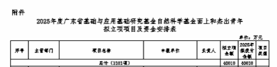 根据《广东省省级财政专项资金管理办法(修订)》等有关规定,经形式审查、通讯评审、会议评审等程序,2025年度广东省基础与应用基础研究基金自然科学基金拟资助面上项目3001项、杰出青年项目100项。其中,我院陈绚、黄煜、高晓斌、龙敏四位老师的项目获得立项资助。(文案:张宇靖 编辑审稿:谢玲)