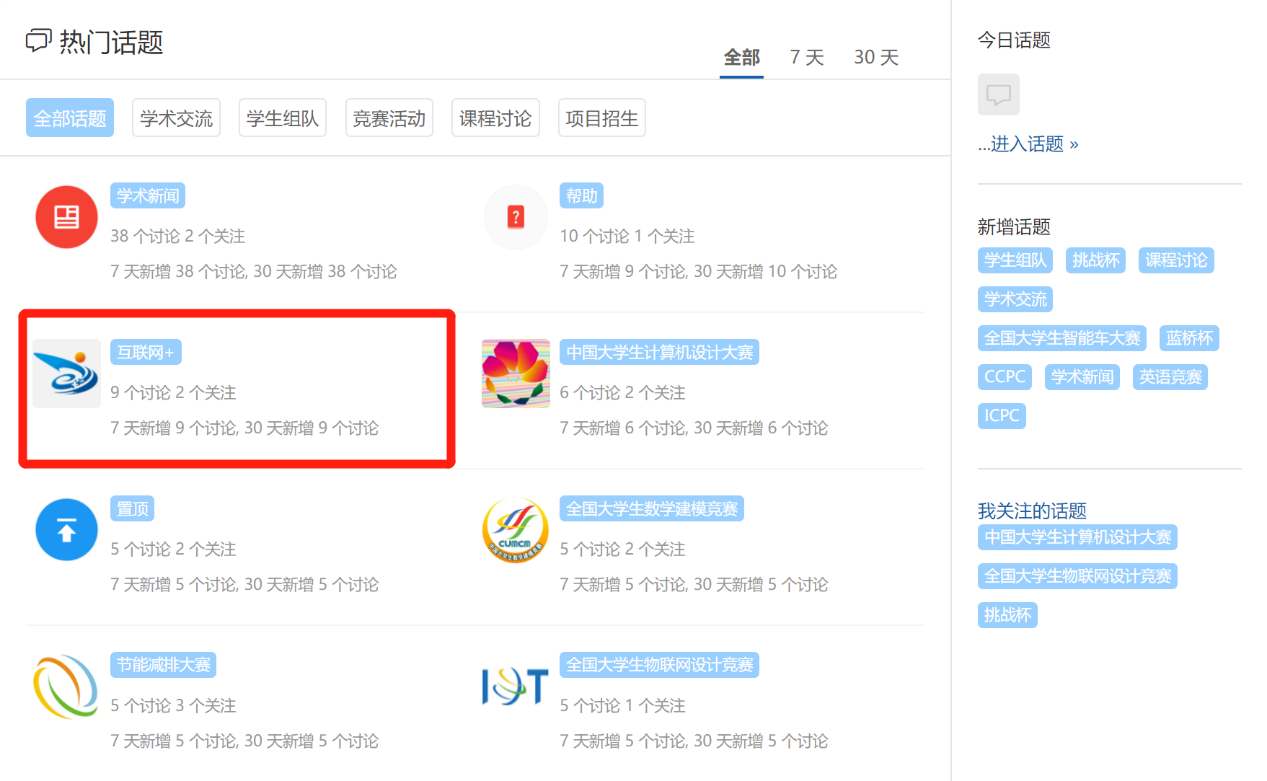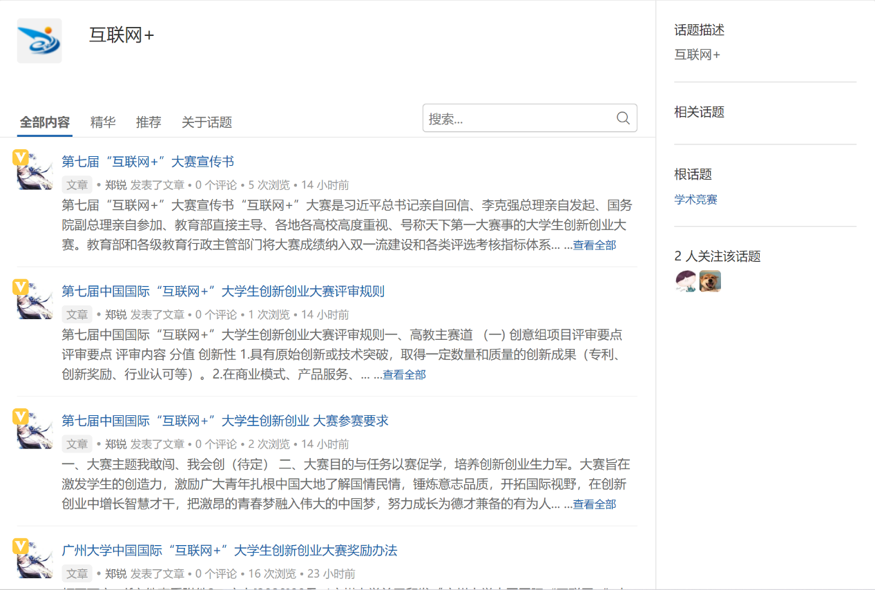 目前,“互联网+”话题中已经收录了大赛宣传书、评审规则、参赛要求、奖励办法等相关信息。