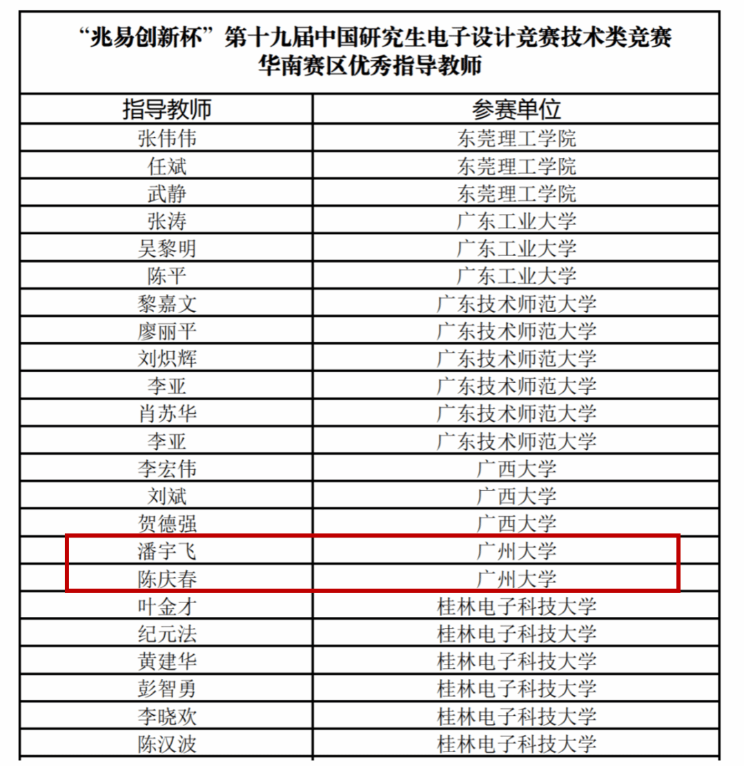 2024年7月10日至11日,“兆易创新杯”第十九届中国研究生电子设计竞赛华南赛区(下文简称“研电赛”)于桂林电子科技大学进行复赛线下评审。我院学子齐心协力,努力拼搏,共获得华南赛区一等奖2项,二等奖1项,三等奖4项,获奖名单见表1。我院陈庆春和潘宇飞两名教师荣获“兆易创新杯”第十九届研电赛华南赛区优秀指导老师,获奖名单见表2。
