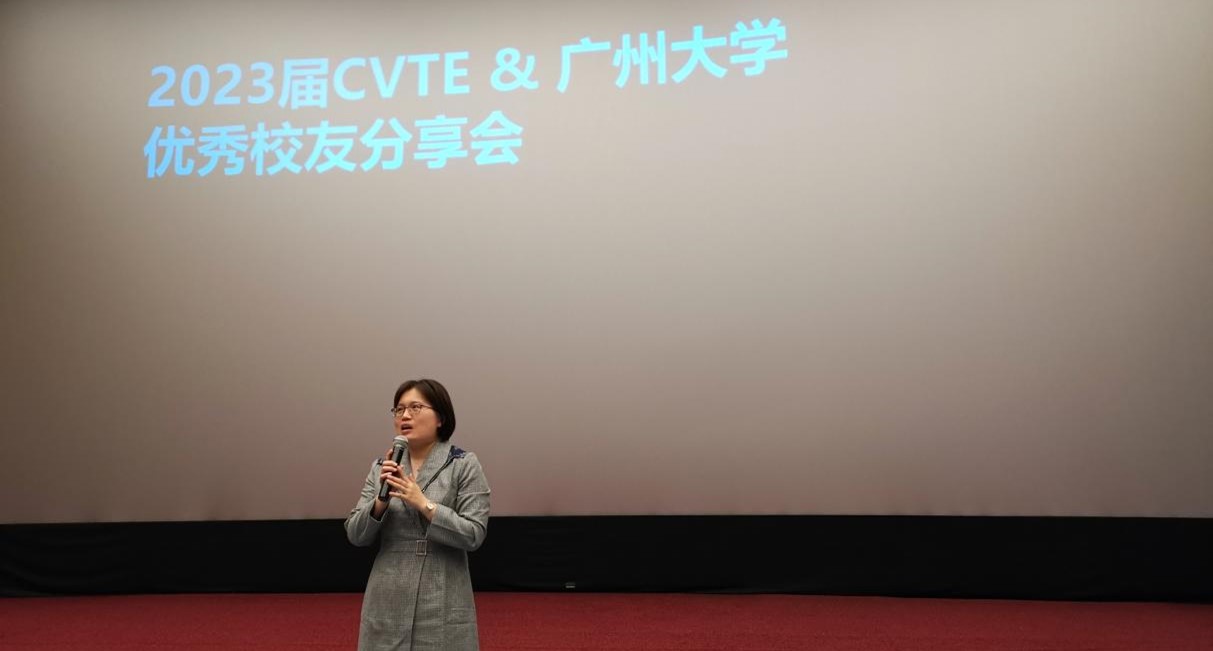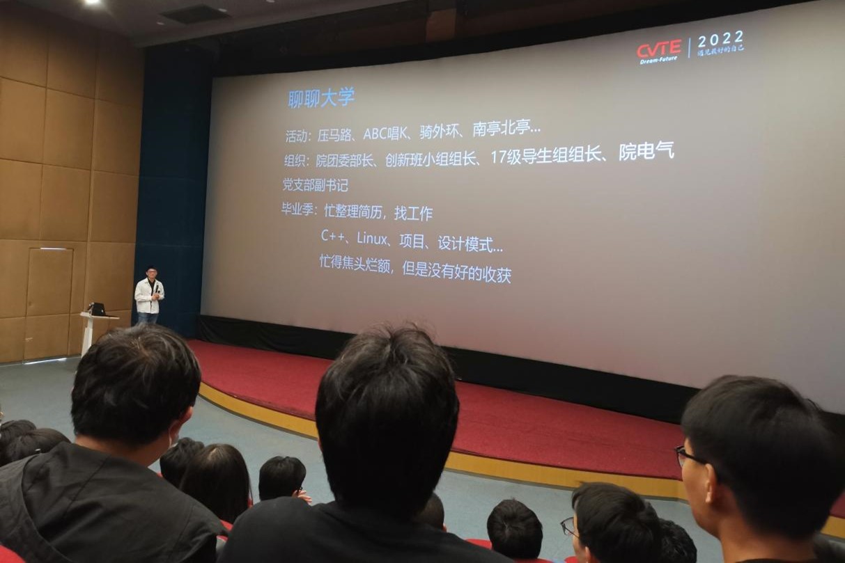 随后,师生一行回到放映厅,由广大19届校友陈伟涛介绍CVTE的发展历程、sm调教、业务模块、最新技术成果、未来发展方向等内容,旨在让师生们对CVTE有更深刻的认识,以及帮助同学们了解目前CVTE所处的各种方向的行业现状。师兄不仅就同学们最关注的CVTE招聘岗位、人才培养政策及福利举措做出了详细解答,还从自身经历出发,针对就业准备、就业选择,就职成长等多方面进行分享,讲述了CVTE对自己毕业后的重大帮助。在分享的最后,师兄也欢迎后续更多优秀的同学投递简历,加入CVTE。